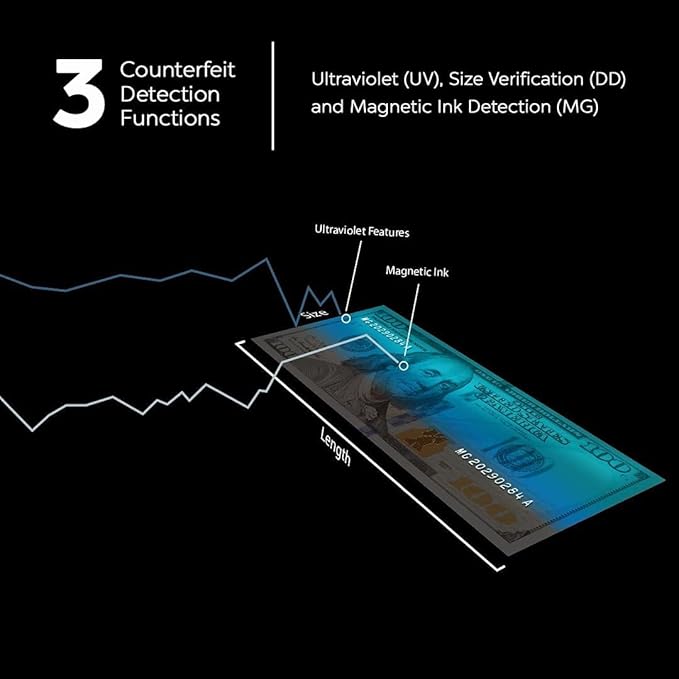 - ULTRAVIOLET + MAGNETIC COUNTERFEIT DETECTION: 3-Point Counterfeit Bills Detector with Visual and audible alerts.