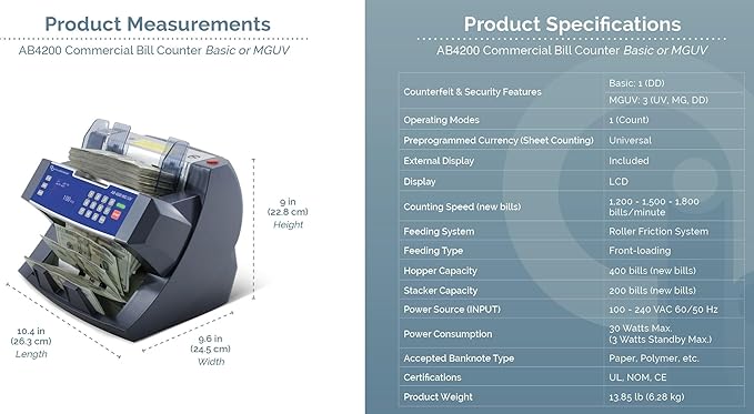 - RELIABLE AND STURDY: The AB4200 is a heavy-duty bank-grade money counter designed for any type of business, ranging from small retailers to large-sized stores.