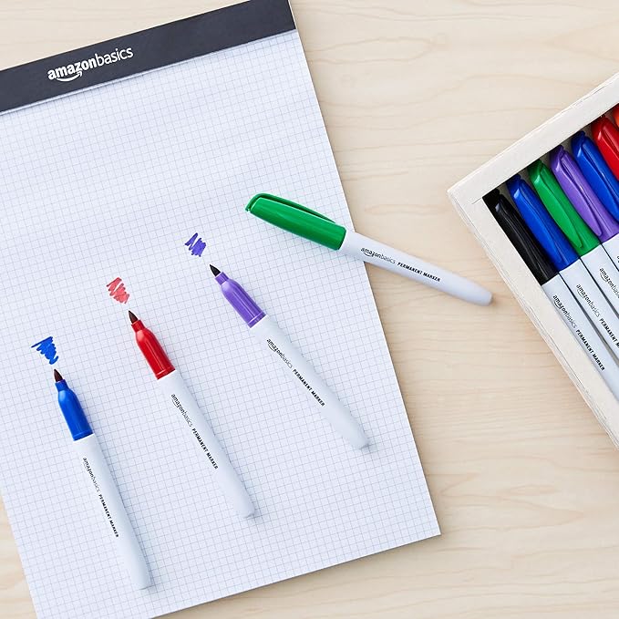 Amazon Basics Fine Tip Point Permanent Markers for Office, School, and Home Use, Assorted Colors, 24 Pack