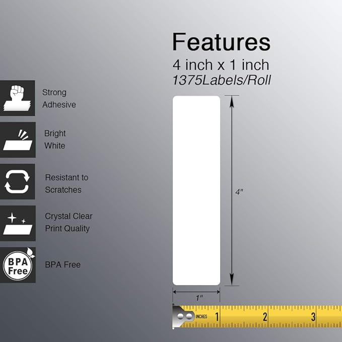 - [ Specifications ]: 4 in x 1 in (102 mm x 25 mm) (1375 Labels/Roll, 1 Roll),Paper tube diameter:1"(25.4mm). No Ink Toner or Ribbons Needed! Save your money and effort.