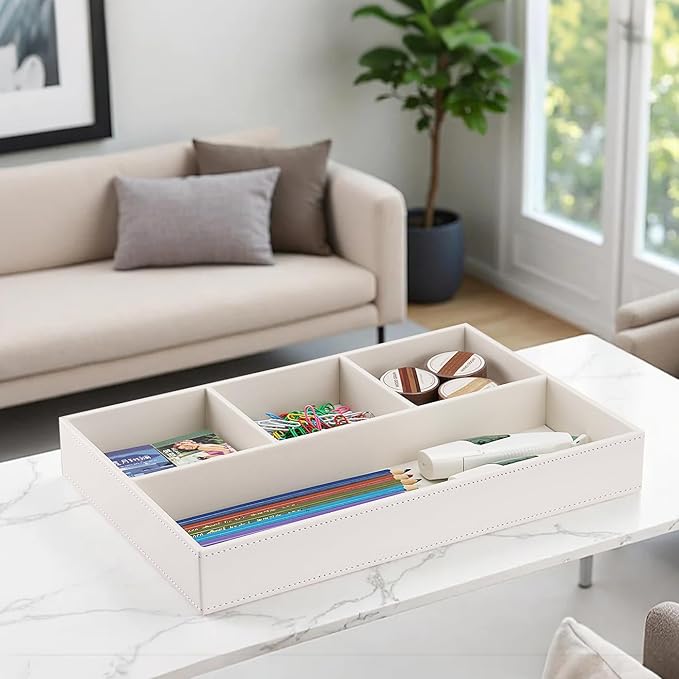 KINGFOM PU Leather Desk Drawer Organizer, 4 Compartment Office Supplies Stationery Storage Tray, Desk Organizers and Accessories Drawer Organizer Tray for Home, Makeup, Jewelry Stackable White