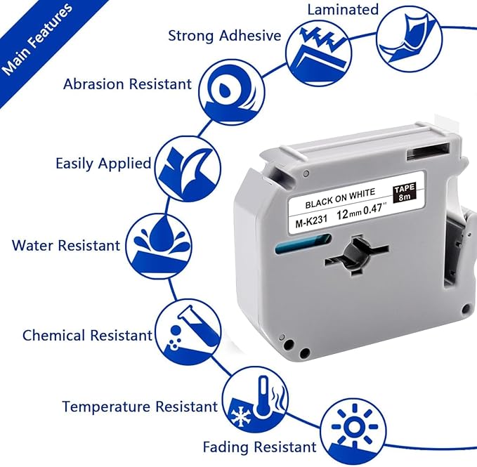 8-Pack MK231 M-K231 Label Tape Replace for Brother P Touch M Tape M-K231S M231 MK231 M-231 12mm 0.47 Inch for Brother PTouch PT-M95 PT-65 PT-80 PT-70 PT-45 PT-90 Label Makers