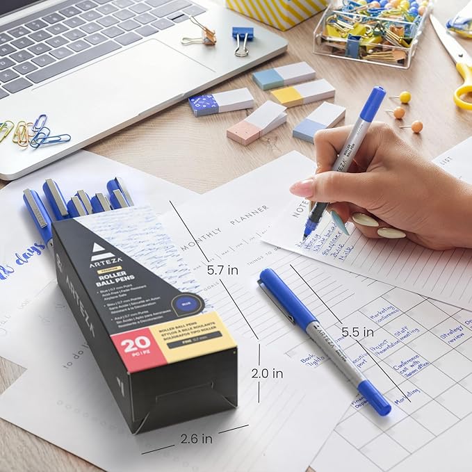 ARTEZA Rollerball Pens, Pack of 20 – Blue Liquid Ink Pens with 0.7 mm Fine Point for Note-Taking, Bullet Journaling, Office & School Writing Tasks
