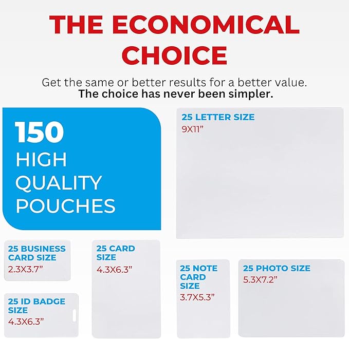 5MIL Thermal Laminating Sheets (150 Count) Letter, Photo, Card, Notecard, ID Badge and Business Card Sizes, Laminating Pouches Compatible with Laminators, Crystal Clear Laminated Finish