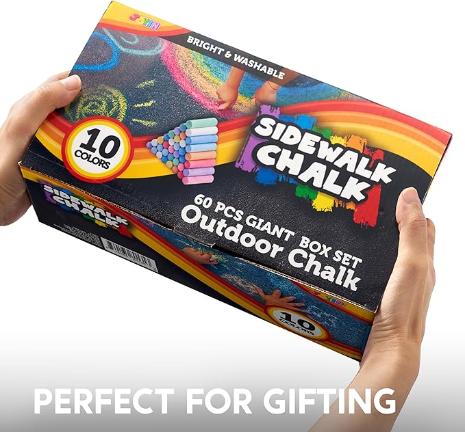 - SPECIAL DESIGN & EASY TO USE. Our Washable Chalks Set will allow your children to get outside and play, give them the opportunity to bring all kinds of artworks outside. Each chalk will give a vibrant color onto any driveway or sidewalk. The chalk can be washed on any surface, you don't have to worry about permanent messes.