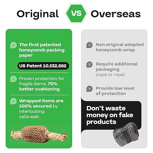 - 【THE ONLY PROVEN SLIT PAPER TECHNOLOGY】 The HexcelWrap produced by slit paper technology was developed over 30 years ago. Five years ago, the technology was improved, and a new interlocking design system was added to create even better packing material with extra cushioning. The newly engineered hexagonal cells allow the honeycomb wrapping to expand as you pull and wrap items in it, creating an interlocking web trap. The achieved three-dimensional cushioning product (paper) replaces traditional plastic, bubble, and other paper-based packaging products in terms of properties and efficiency