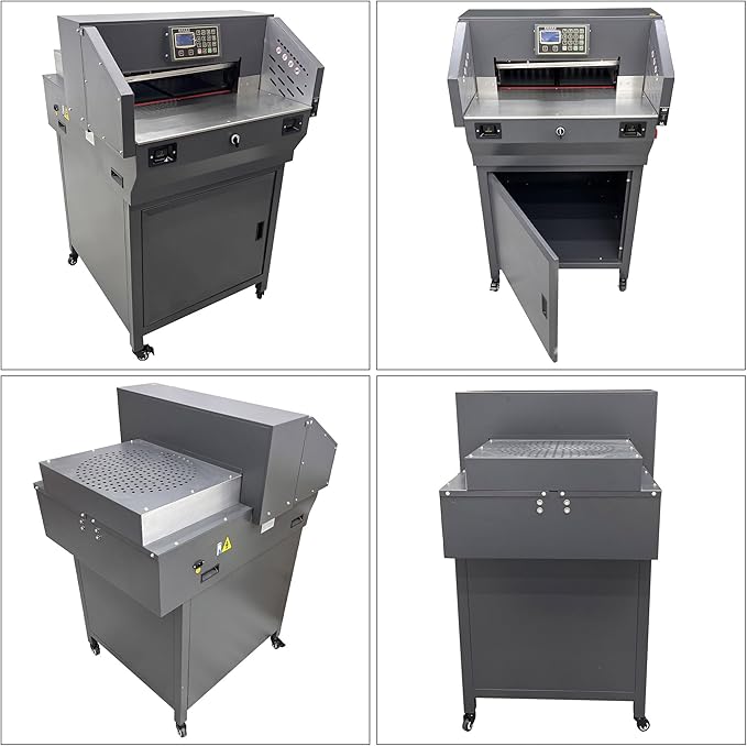 - Three Motor & Double Guide Cutting -- The paper cutter has three motors: paper pushing motor, paper pressing motor and paper cutting motor. Pushing, pressing, and cutting are all controlled by independent motors; Double-bar push paper, the paper advances smoothly, not easy to skew, and the cutting is more precise.