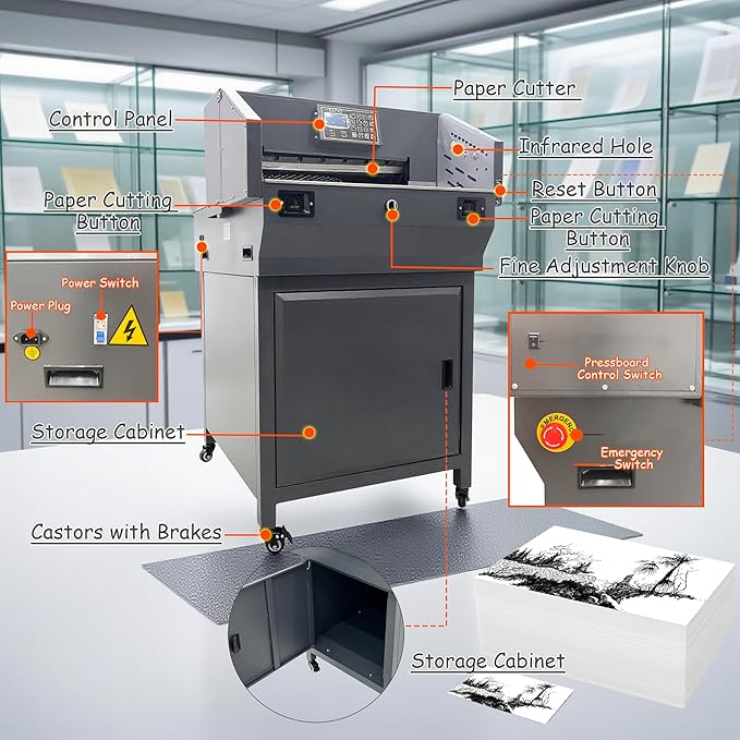 - Photoelectric Protection Design -- This paper cutter guillotine is designed with photoelectric protection. When foreign materials such as fingers enter the cutter, the machine will stop immediately, which can prevent accidents, it is very safe for the operator. Note: The paper can be pushed out by turning the paper pusher button to the right. Do not put your hand in.