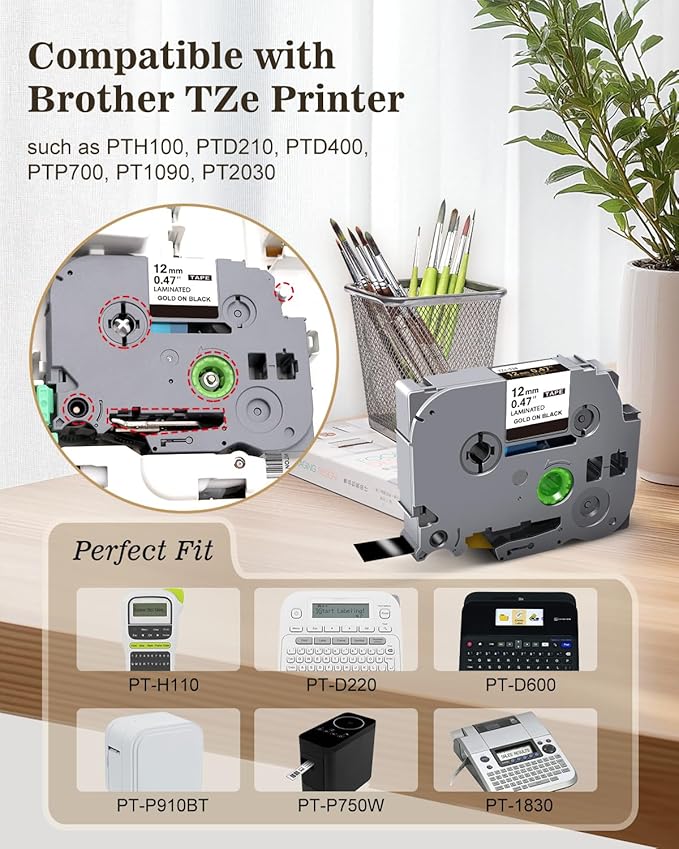 - Lasting & Practical Laminated Tape: Compatible with Brother label maker tape gold on black is standard laminated label. Print clearly and enduring. Resist to water, oil, fade, abrasion, chemical, heat and cold.