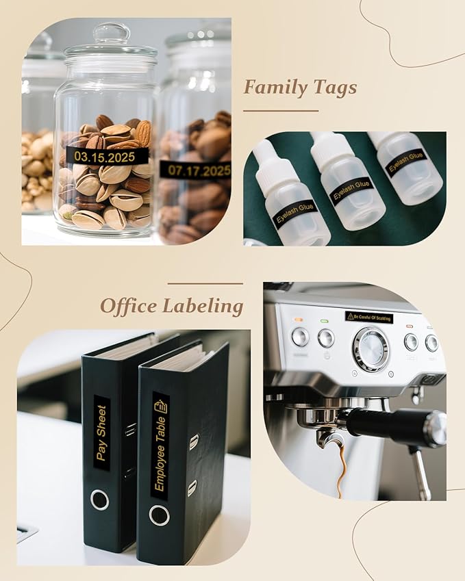 - Suitable for Outdoor and Indoor: Gold label maker tz tape has a self-adhesive backing. Widely used in offices, laboratories, kitchens, homes, warehouses, hotels, supermarkets, schools, etc.