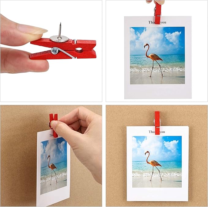 - Wooden clips combine the advantages of clips and pins to enable damage-free display of photos, pictures and notes on a corkboard or bulletin board. And you don't have to remove and insert them from the corkboard as often