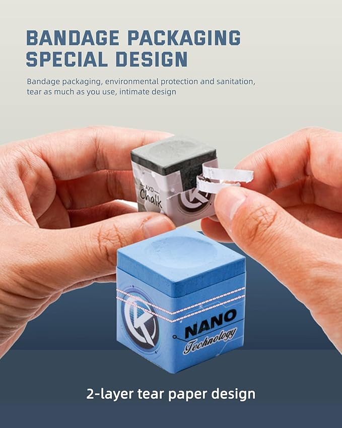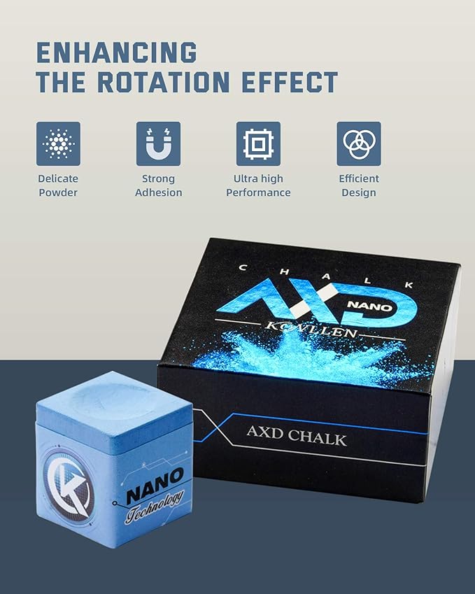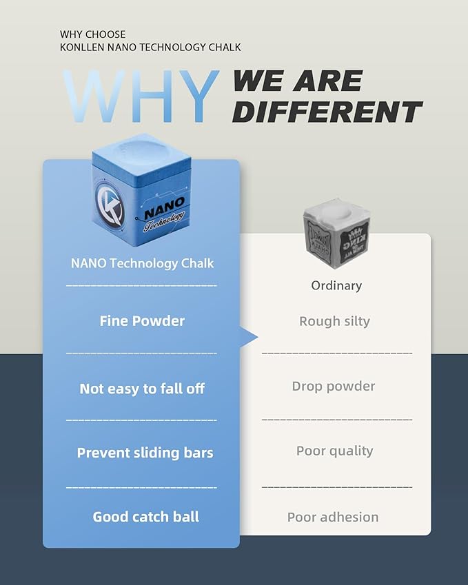 - Nano Technology: KONLLEN pool hand chalk utilizes revolutionary nano-materials, ensuring an ultra-fine texture with superior adhesion. It resists flaking and spreading, making it more environmentally friendly and healthier. With KONLLEN, you can achieve the best feel and performance in any condition.