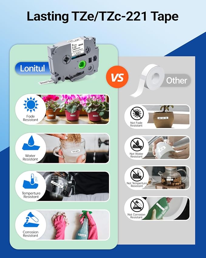 - Package Contents : 3-pack Lonitul tze 221 tape Replacement for Brother P Touch label tape TZe-221 TZe221 TZ221, Black Ink on White, Laminated process.