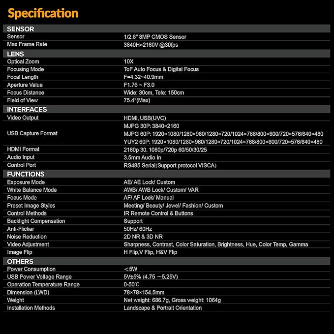 - 【ToF Ranging Technology, Fast and Accurate Auto focus】The livestream camera uses advanced ToF ranging technology to quickly and accurately measure the distance between the target and the lens. This allows the camera to quickly focus on the target when switching between far and nearscenes in live streaming, ensuring that the subject of the shot is always clear and in focus.