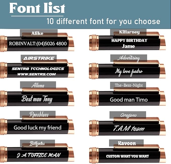 - FREE PERSONALIZATION You can have up to 50 characters (including spaces) on each line, up to 2 customized lines are free. we use laser engraving technology to engrave the text on the pen without fading. As long as you click the "Customize" option, you can easily customize it. Beautiful appearance, suitable for gift.