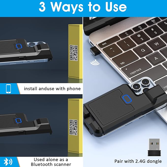 - 【Wireless Bluetooth Barcode Scanner for Phone】: Alacrity back clip barcode scanner specially equipped 3 types of connection ways with Bluetooth, 2.4G wireless and usb wired, not only compatible with the phone, ipad, also can work with computer, POS. with super strong compatibility, can be flexibly switched according to needs.