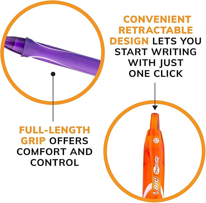- Convenient retractable gel pens with a full-length comfortable grip and plastic clip