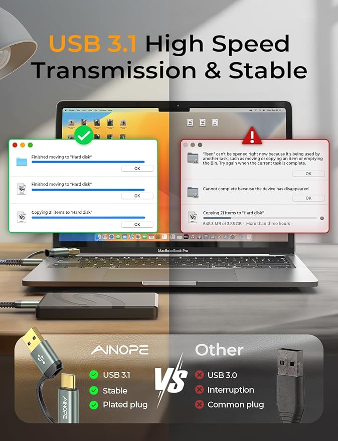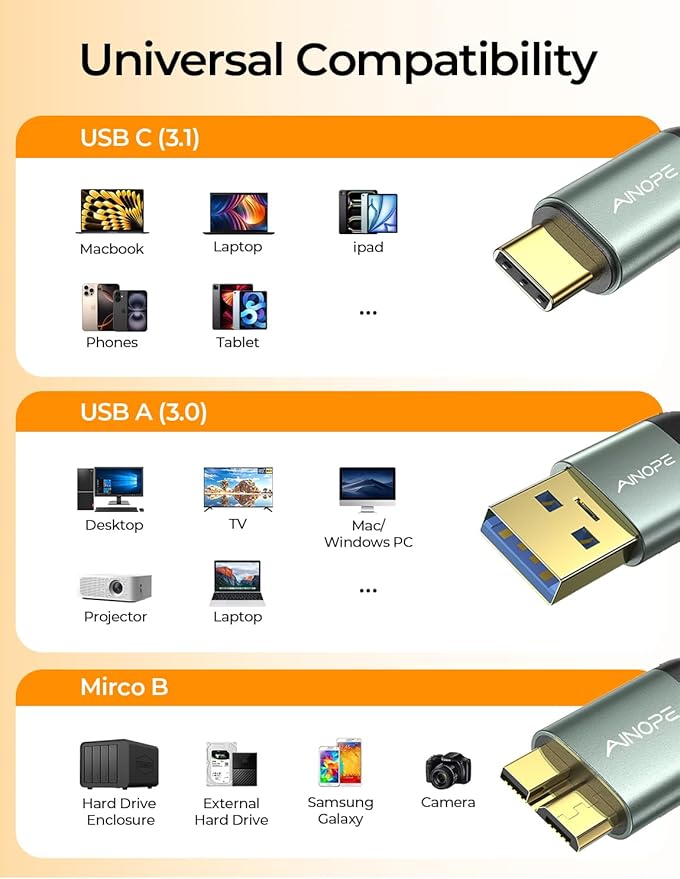 - 【New Upgrade Generation】AINOPE have finished quantities research for product feedbacks. Most of customers refer to the USB 3.1&3.0 hard drive cables on the market, including their slow transfer rates, incompatibility with their computer, and plastic construction. Hence, now that these problems have been resolved, you don't need to buy extra cables for each interface. We are offering you an updated micro USB 3.0 hard drive cable with faster transfer rates and a nylon braided design.