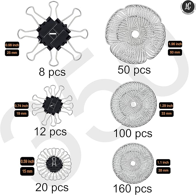 - Assorted Sizes for All Your Needs - Each pack contains 160, 100, and 50 pieces of assorted paper clips (28mm, 33mm, 50mm). Get 20, 12, and 8 pieces of the paper binder clips (15mm, 19mm, 25mm), too!