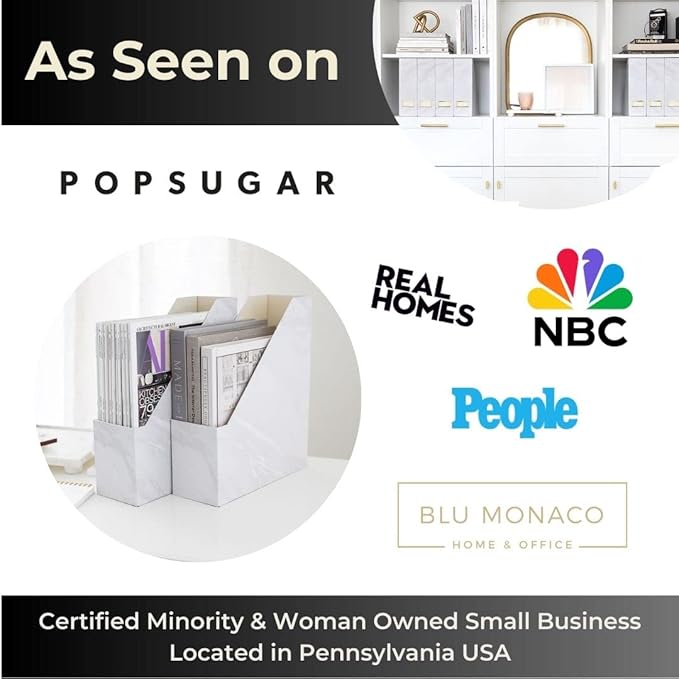 BLU MONACO Set of 4 Magazine Holders, White Marble Design with Gold Label Holders, File Holder for Desk, Magazine Storage for Home Office and Classroom