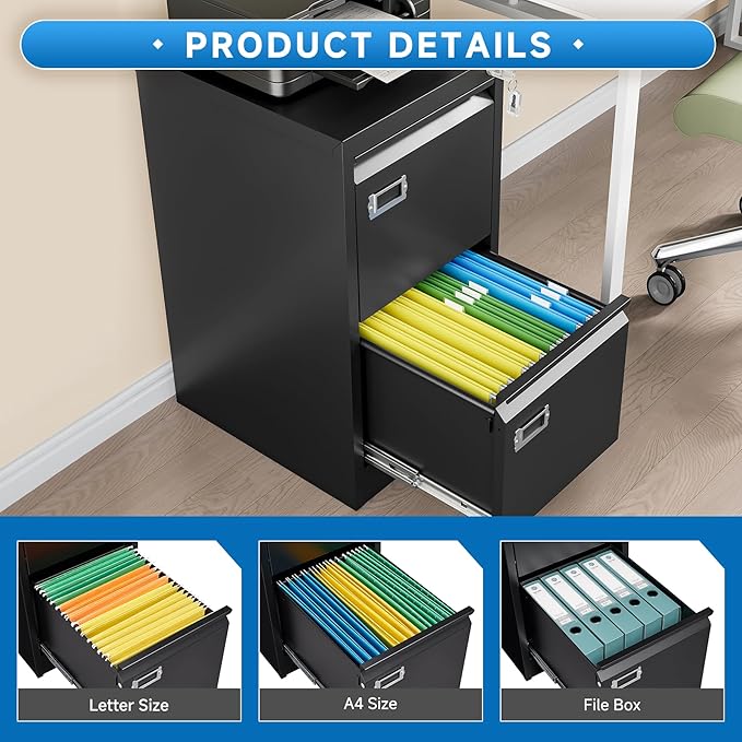 - 【HIGH CAPACITY】This vertical file cabinet for home office has 2 drawers of large storage space, fully retractable ball bearing drawer slide rails for easy access to all folders, file drawers with adjustable hanging rods can hang A4 size, letter size or legal size hanging folders to let your files Well organiz