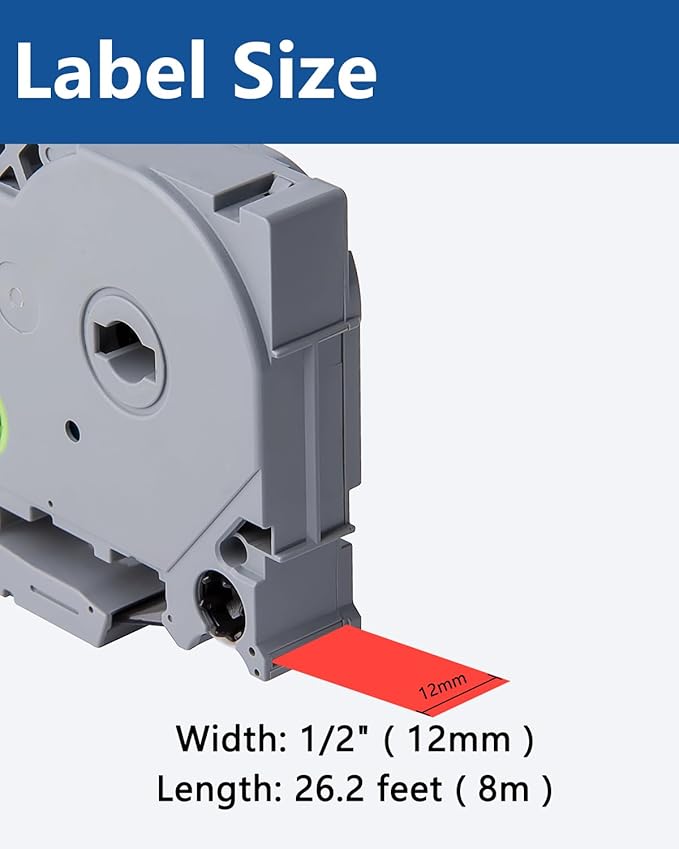 - Size - 1/2" width x 26.2' length ( 12mm x 8m ) each 12mm label maker tape. Color - Black ink on red tape