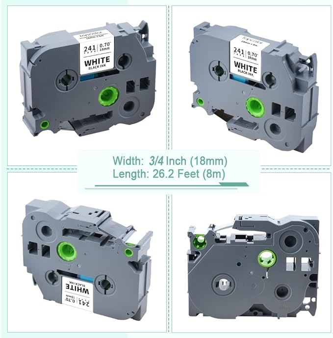 - Package Content: 6-Pack 18mm 0.7 inch laminated white tape compatible with Brother Tze-241 3/4" p touch label tape Tze241 Tz 241 Tz241 Tz-241. Size: 3/4 inch (18mm 0.7") x 26.2 feet (8m) Each TZe-241 18mm 0.7 laminated white tz Tape. Color: Black Ink on White Background
