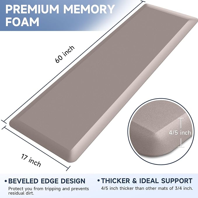 4/5 Inch Thick Kitchen Mat Anti Fatigue Mat Kitchen Rugs Kitchen Decor Non-Slip, Stain Resistant, Waterproof Kitchen Mats Desk Mat for Kitchen, Office, Workshop, Khaki, 17'' x 60''