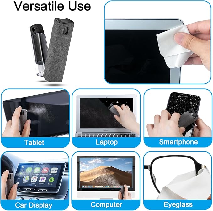 - Screen Cleaner Mist and Microfiber Fiber Cloth for Electronics: They are cleaning, antistatic, and degreasing. Easy to remove the oil and fingerprint from the screen of cell phone, tablet PC, laptop, indicator, TV, iPad, iPhone, Macbook, watch, monitors, e-Readers, Kindle car displays screen; the glass of eyeglasses, sunglasses, the lens of the camera, etc.