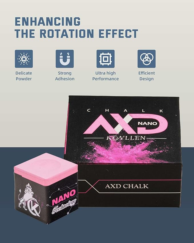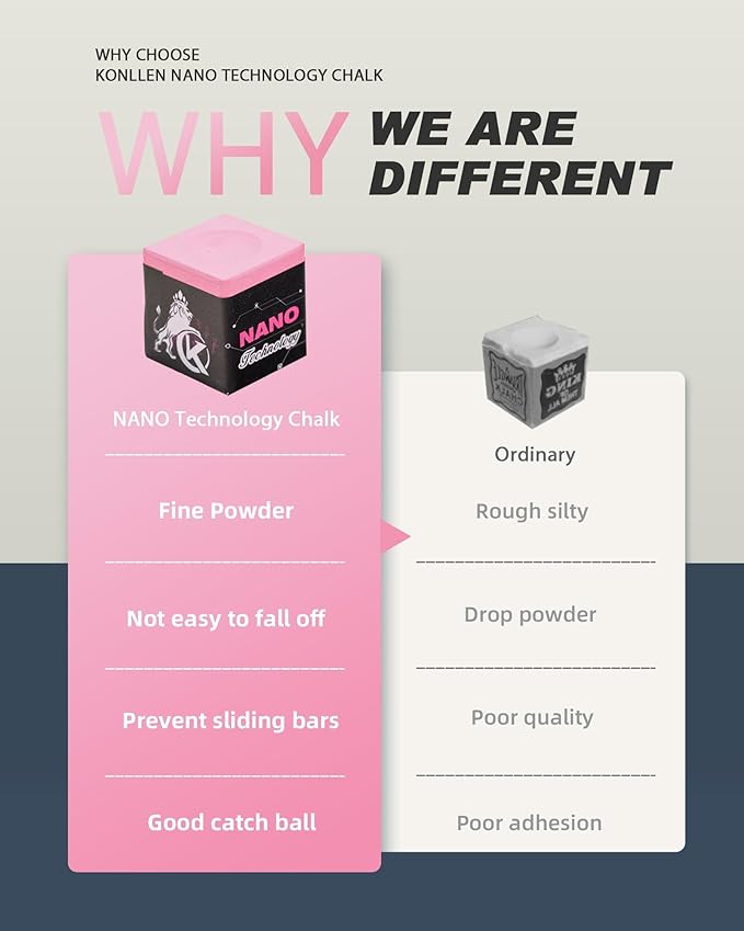 - The Right Choice: Unlock your true potential on the billiards table with KONLLEN Chalk, the ultimate choice for players who demand professional-grade performance. KONLLEN Chalk delivers unmatched control, spin, and durability, ensuring every shot is executed with precision and confidence.