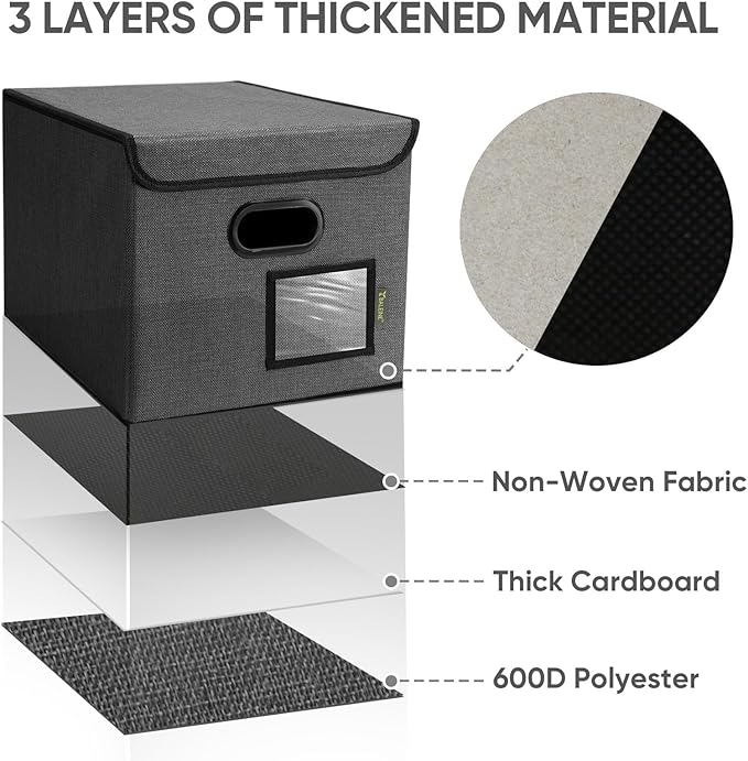 - [OPTIMIZED DESIGN] Designed with convenience in mind, our file storage box helps to elevate your efficiency and organization. The transparent label slot allows for quick identification of the contents stored inside the box. The collapsible design and sturdy handles ensure effortless storage and movement, making it convenient and easy to use.