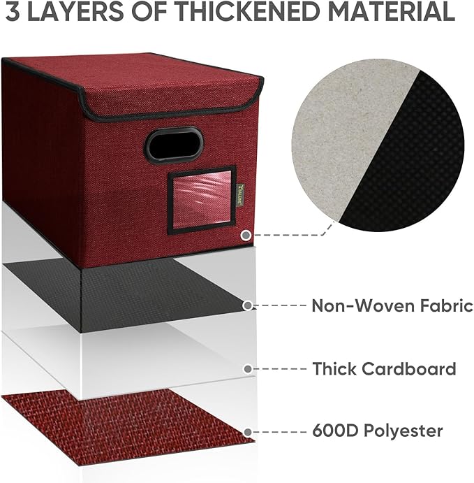 - [DURABLE MATERIAL] The outer layer of our filing box is crafted from high-quality polyester fabric and reinforced with thick cardboard in the middle. This construction ensures that the box maintains its shape and provides better bearing capacity for important documents and files. Its textured appearance can also serve as a stylish decorative element in any office or home.