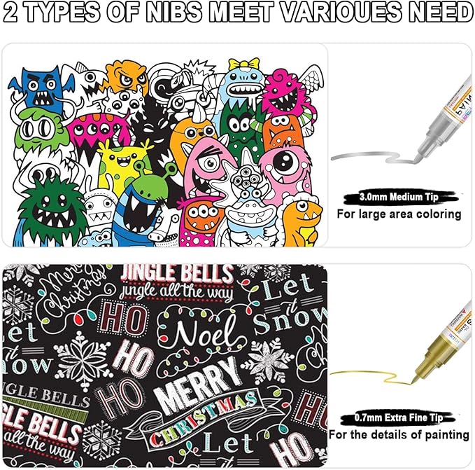 - 【Dual Tip Paint Markers】 Each acrylic paint markers has two types of tips: a 0.7mm fine tip and a 3mm medium tip.The fine tip is suitable for outlining and fine line work,while the medium tip works well for large areas of coloring and detailing.This ingenious design allows you to effortlessly switch between fine lines and bold strokes.