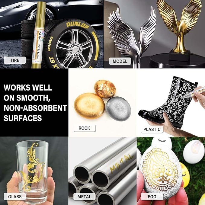 - 【4 Pack Gold and Silver Acrylic Pens】Each set contains 2 Gold acrylic paint pens and 2 Silver acrylic pens. Immerse yourself in the captivating brilliance of metallic gold and silver ink. These pens are meticulously formulated to deliver a radiant, shimmering finish that adds a touch of elegance and sophistication to your artwork. [Warm tips: For maximum luster, Do not touch your painted parts for at least 12 hours, it takes a while to dry and cure.]