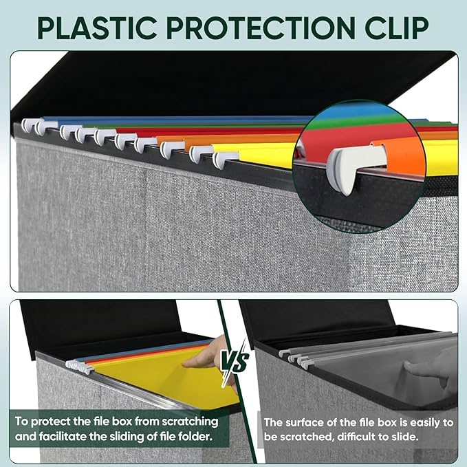 - [UNIVERSAL SIZE] Our file box with lid fits letter-sized files. It is designed for efficiency and functionality, with its smooth PVC slide rails on both sides, you can effortlessly slide file folders for easy access and neatly arranged. The lid fits snugly on the box after hanging folders. (NOTE: file folders are not included)