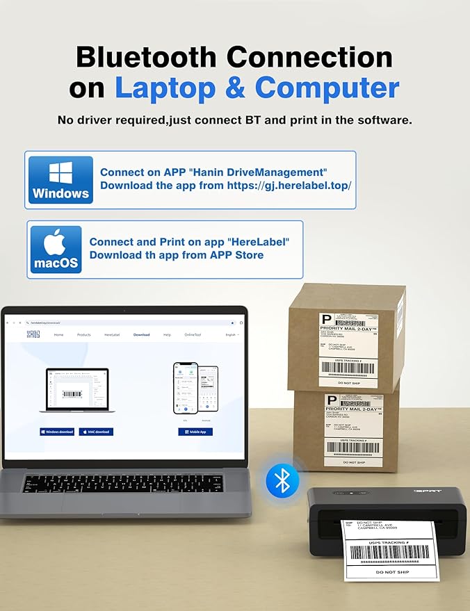 - Shipping Label Printer - Windows / macOS all support Bluetooth connecting via software "Hanin Drive Management" / "HereLabel". (Since we have updated it, please not install the driver from the USB drive). And laptops can also print via USB after install driver.