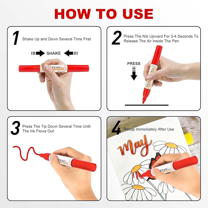 - 【Pay Attention】 For the first time,there are only three simple steps to use this pen.First,shake the pen fully,with the nib pointing upwards to expel the air inside the barrel,then press the nib downwards to fill the nib with ink,then it can be used normally. After each use,please remember to put the cap on to prevent the product from drying out!Each paint marker pen is packed in a separate heat shrink film to avoid leakage during shipping and storage.