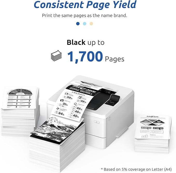 - Estimated page yield: 1,700 pages per toner cartridge at 5% coverage (Letter/A4)