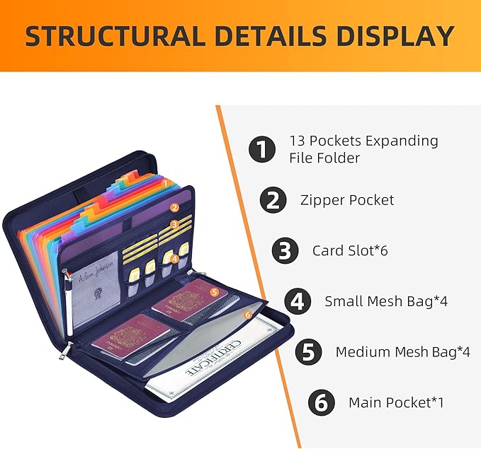 - EXPANSIVE CAPACITY: Discover the ease of JUNDUN's Accordion Document Organizer. Boasting 13 pockets, 1 zip pocket, 1 pen and 6 card slots, along with 4 small and 4 medium mesh bags – all thoughtfully fitted into a streamlined 13.97"x10.43"x1.96" frame. Securely house essential documents and belongings while effortlessly categorizing and swiftly accessing your files