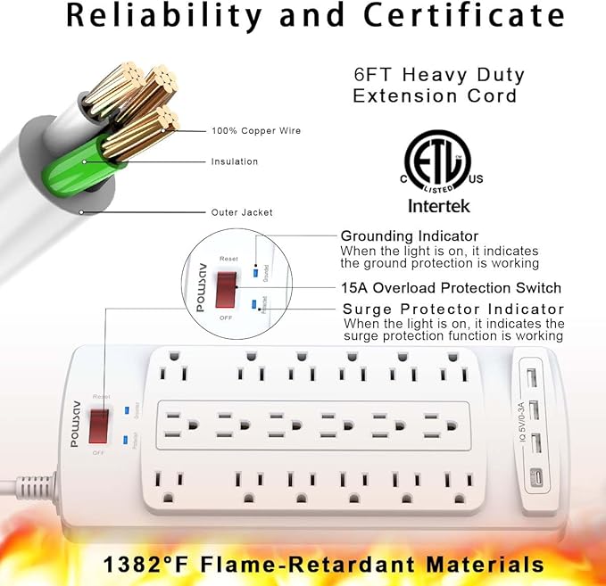 - Safety and Certificate: ETL safety certified, with extension cord and other major components certified by UL. The over current protection switch limits the power strip's working current to certain setting, so it will not get hot during usage. Environmental protection and fire-resistance PC shell with flame retardant at 1382℉ makes it more durable and longer lifetime.