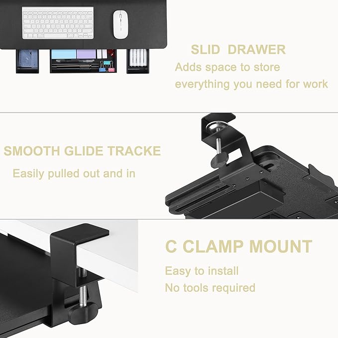 Keyboard Tray Under Desk with Drawer,26.77" X 11.81" Keyboard Tray Large Size with C Clamp-on Mount, Easy to Install, Save Space for Office Desk (Black)