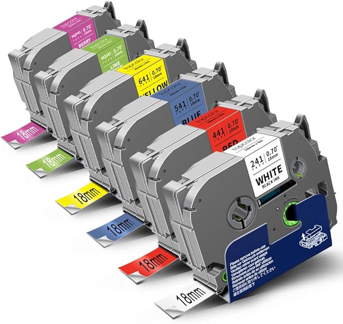 - Package Content: 6 Pack 18mm Label Tape Compatible with Brother ptouch tape 18mm 0.7 TZ-241 TZ-441 TZ-541 TZ-641 TZ-MQG45 TZ-MQP45 tze tz tape 18mm 3/4" label maker refills; Size: 0.7 inch x 26.24 feet ( 18mm x 8m ). Color: Black on White / Red / Blue / Yellow, White on Berry Pink / Lime Green