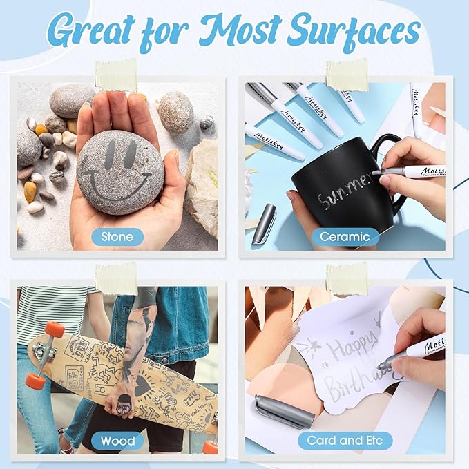 - Nice for Most Surfaces: these silver pens work well on most surfaces, such as paper, wood, enamel, chalkboards, canvas, wood, brick, stone, glass, mirrors, windows, metal, plastic, ceramic, fabric, etc.; Decorate your clothes, gift bags, shoes, and personalize coasters, coffee mugs, journals and other crafts