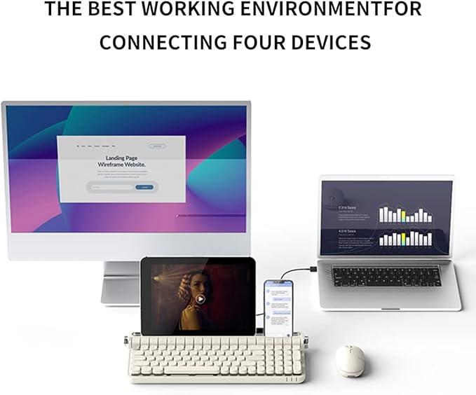 - 【100-Key Typewriter Keyboard with Knob Contro & numpad】 B705 Retro typewriter keyboard is compact, and still has 100 keys (including 12 convenient multimedia keys) and all the functions a typist needs to type efficiently.2 function knobs: Turn the left knob to change the connection channel. Turn the right knob to change the volume.B705 Retro Mechanical Keyboard is versatility and compact design make it ideal for desk accessories and workspace organizers.