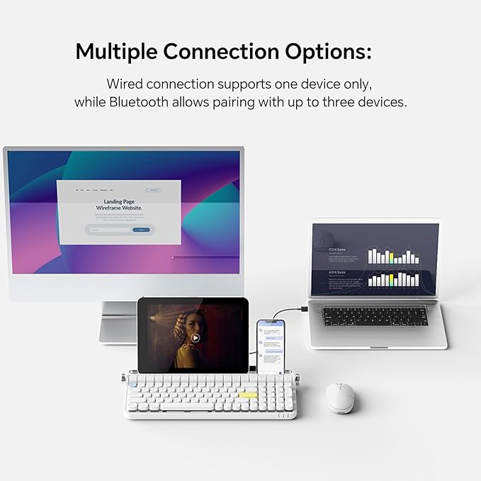 - 【Easy to Connect and More Compatiblity】The dual mode of wired and Bluetooth connection can be switched at will with the function switch button.It can support 3 devices at the same time via Bluetooth wireless connection.Wide compatibility, can be used on iOS,Android,Windows and other devices.Supported operating systems:Windows/ANDROID/ISO/Mac.