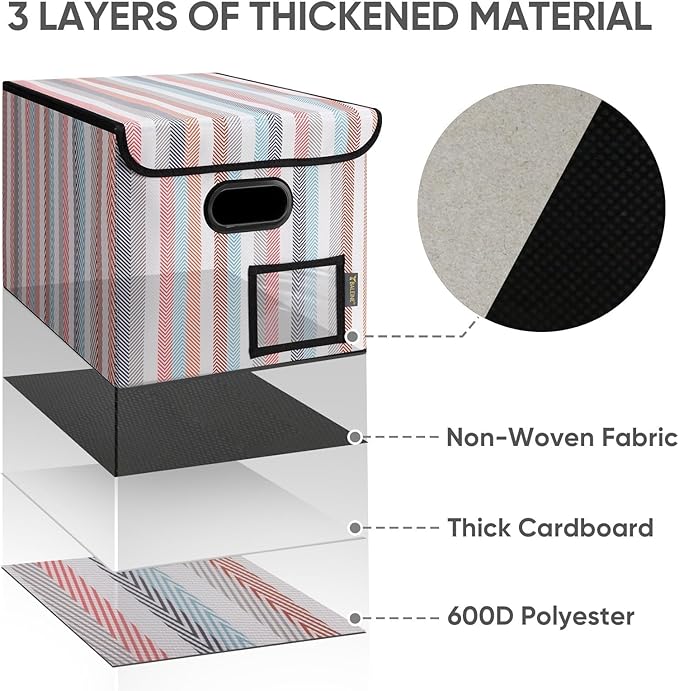 - [DURABLE MATERIAL] The outer layer of our filing box is crafted from high-quality polyester fabric and reinforced with thick cardboard in the middle. This construction ensures that the box maintains its shape and provides better bearing capacity for important documents and files. Its textured appearance can also serve as a stylish decorative element in any office or home.