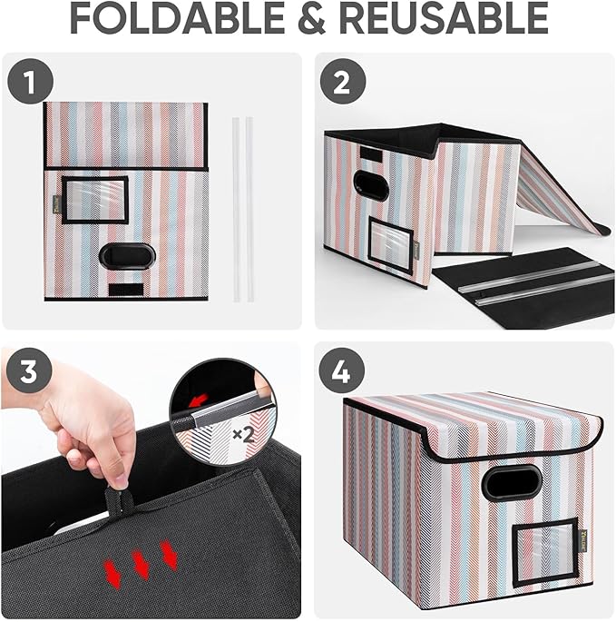 - [OPTIMIZED DESIGN] Designed with convenience in mind, our file storage box helps to elevate your efficiency and organization. The transparent label slot allows for quick identification of the contents stored inside the box. The collapsible design and sturdy handles ensure effortless storage and movement, making it convenient and easy to use.