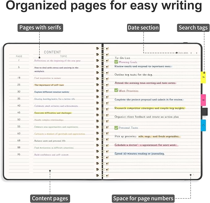 - ORGANIZED AND PRACTICAL NOTEBOOK: Our lined spiral notebook features 110 numbered pages and 4-page blank table of contents. In a large A4 size 8.5" x 11", providing ample writing space while remaining lightweight and easy to carry