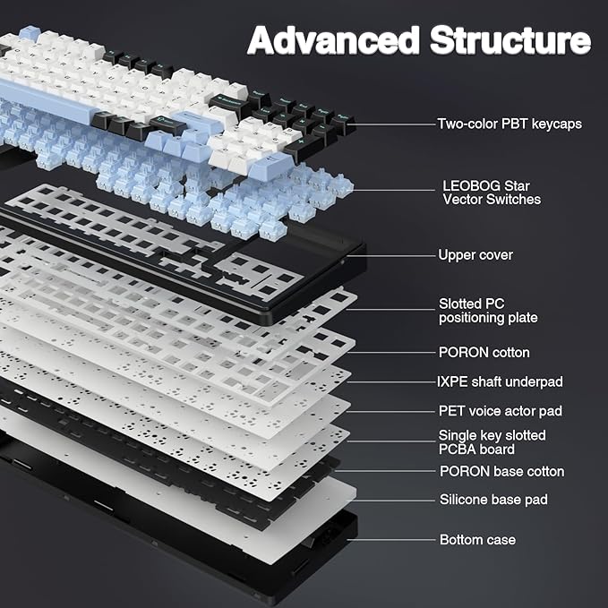 - Advanced Structure and PCB Single Key Slotting: This computer keyboard features a advanced structure, extended integrated silicone pad, and PCB single key slotting, better optimizes resilience and stability, making the hand feel softer and more elastic. Five layers of filling silencer fills the gap between the PCB, the positioning plate and the shaft,effectively counteracting the cavity noise sound of the shaft hitting the positioning plate, and providing a solid feel
