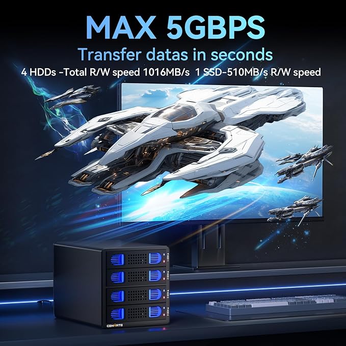 - 【Up to 5Gbps】This 4 bay enclosure equips with advanced chip and USB 3.0 output interface, Max 5Gbps under UASP control.Transfer 1G movie in 3-5 seconds with USB 3.0 Ports, which is 10 times faster than USB 2.0.